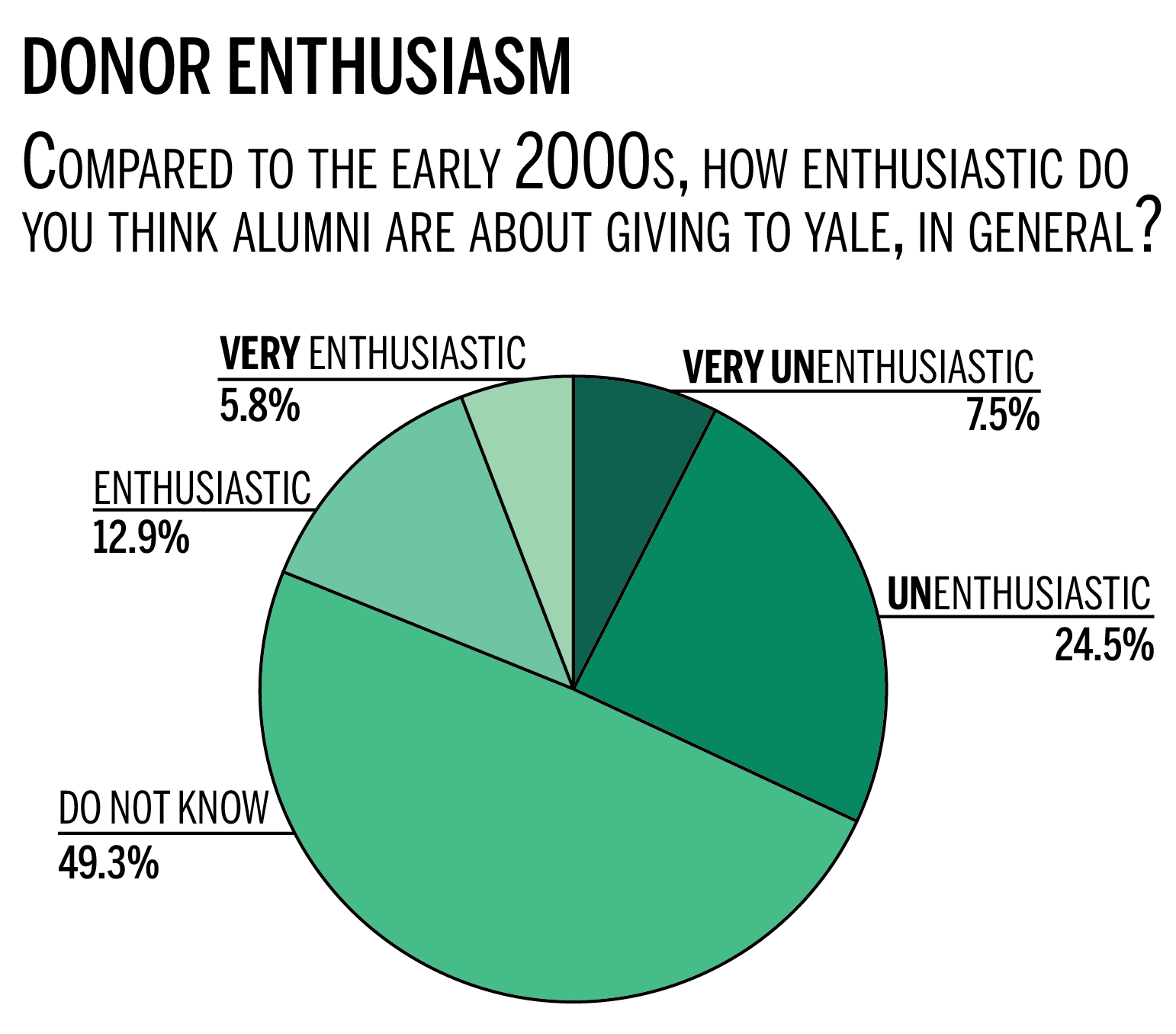 The News surveyed all 1,301 individuals listed in the Alumni Leaders Directory — which includes Yale Club officers, class officers, regional directors and reunion chairs — and gathered responses from almost 250 alumni. The survey results suggested that alumni are less willing to donate to Yale compared to the early 2000s.