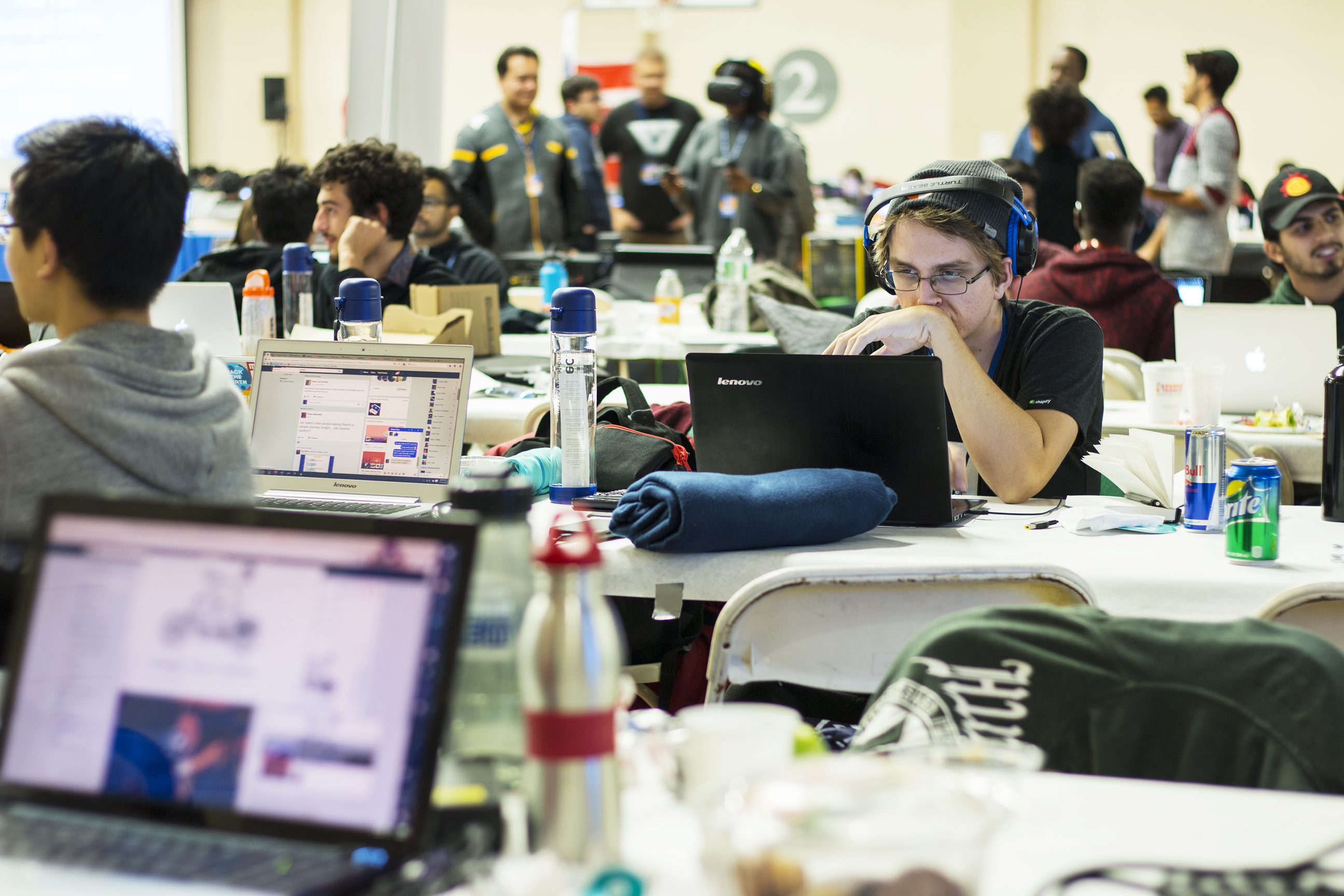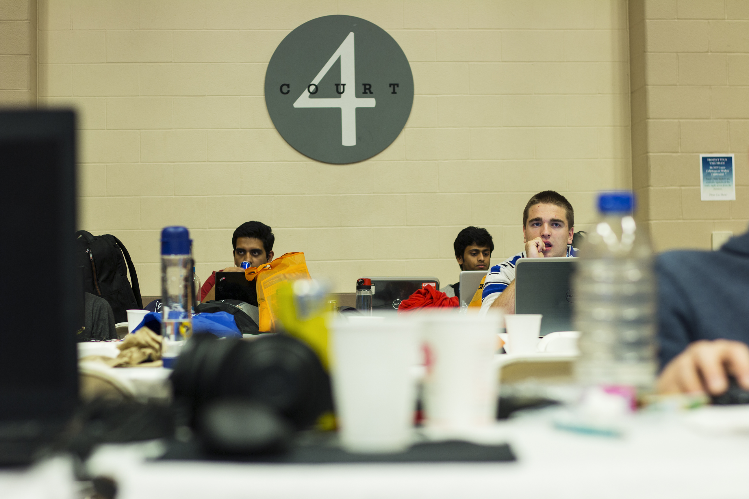 After dropping off my stuff along one of Lanman’s edges, I set up a tripod and spend about an hour walking around, getting photos of the hackers. Probably because my camera rig is quite large, I get a lot of looks — most curious, some slightly annoyed — which I find interesting. I begin to feel self-conscious — something to do with being turned into an object of interest by one’s objects of interest. But this is CS, so I try not to over-intellectualize it.