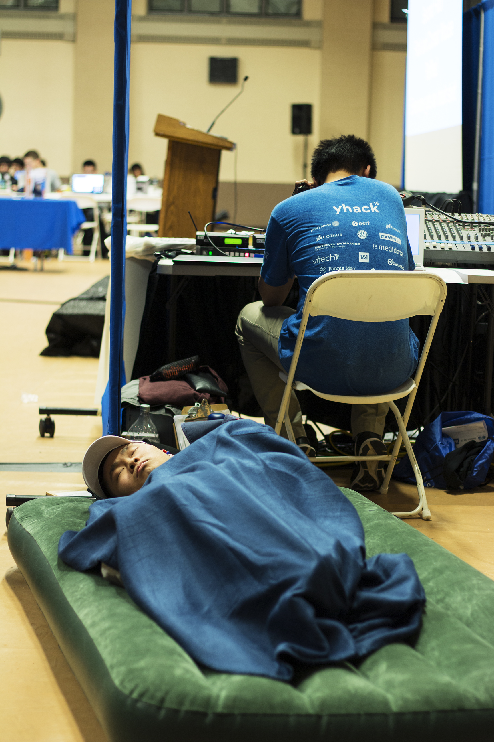 After watching the end of the rap battle and taking a short walk around the main floor of Lanman — during which I act as a sort of tour guide, pointing out to my friend the YHack detritus of sleeping bags, Red Bull pyramids and dead eyes — my friend and I decide to try to get some schoolwork done. My enthusiasm for YHack, though strong as ever, isn’t going to impress McKinsey. We decide to work upstairs, on the elevated track that runs along the perimeter of Lanman, where organizers have spread hundreds of communal air mattresses for YHackers who need a little shuteye during the 36-hour sprint. We each claim a mattress and settle in. We agree to work for a few hours, then head out.