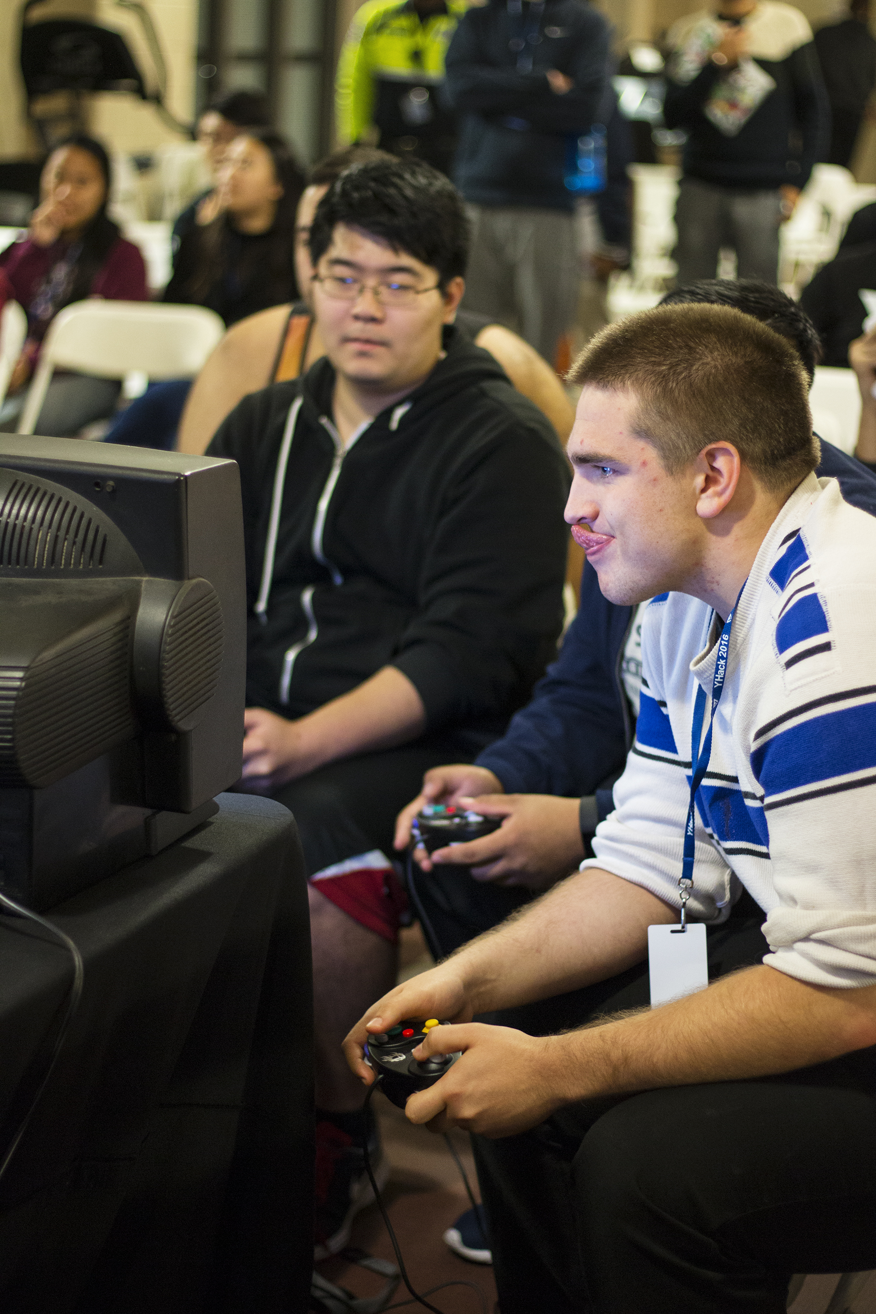 Somewhat restored, I get up and walk over to the elevator and take it to Lanman’s upper level, where event organizers have started the annual Super Smash Bros. tournament. The scene is exactly what you’d expect. Wide eyes directed all at one screen. Button-mashing, not quite in sync but also not cacophonous in its harmony. Cheers that seem excessively loud to an observer not following the action. Picture it: A middle school boy’s sleepover relocated to a collegiate gym.