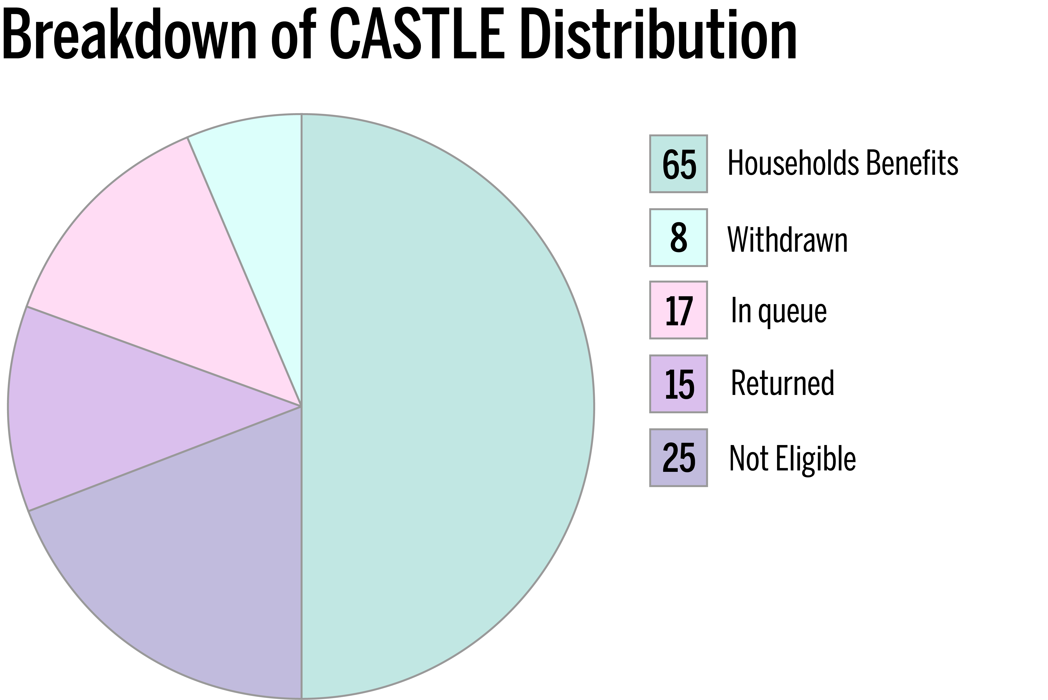 However, only 130 CASTLE applications have been received by the LCI to date, 65 of which were accepted. While 17 remain in the queue to be reviewed, the rest were declared ineligible, withdrawn or returned due to reasons such as landlord reluctance.